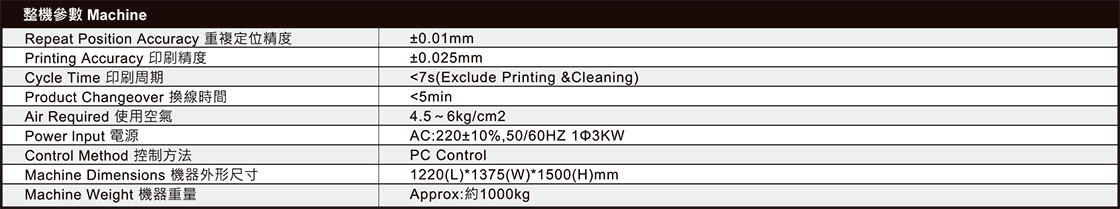 ◆ 人性化設計 ◆ 適用範圍廣,通用性強 ◆ 獨特的噴淋式自動清洗系統 ◆ 高效節能的擦拭紙結構 ◆ 獨特的圖像處理系統 ◆ 智能型的印刷生產模式 ◆ 印刷範圍 : 400mm*340mm ◆ 採用國際通用的UVW三軸聯動式平台 ◆ 機器外型尺寸 : 1220mm*1355mm*1500mm ◆ 機器選配、自動加錫功能、自動鋼網堵孔檢測功能、自動點膠功能、刮刀壓力反饋功能、自動MSE/SPI聯機功能、自動溫濕功能