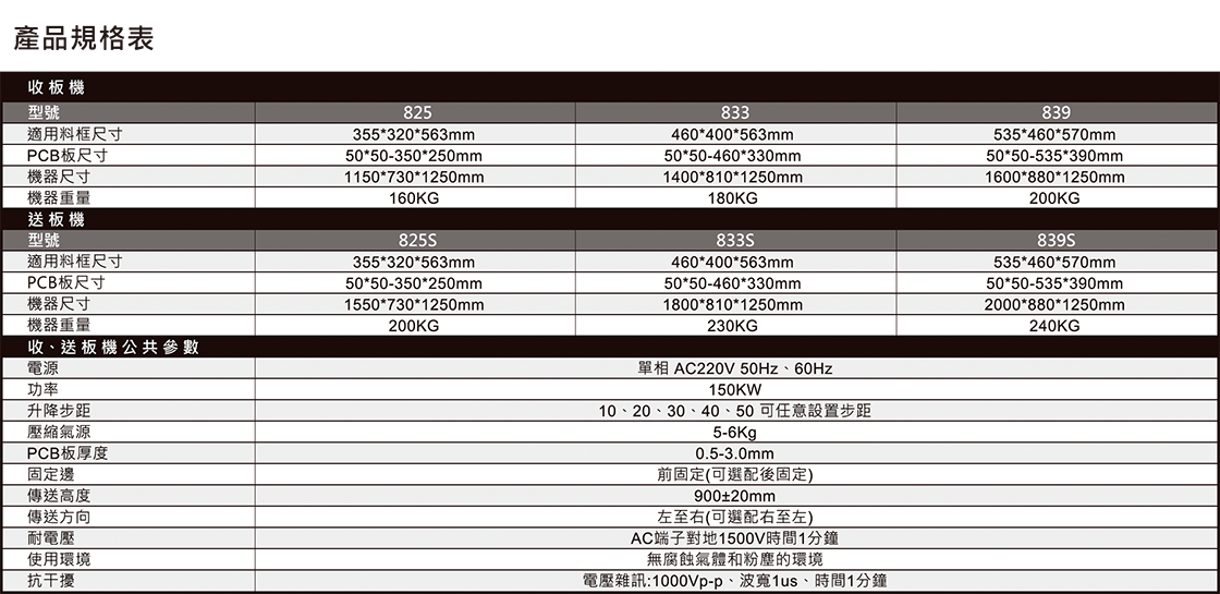 ◆ 外型結構:板金結構與鋁型材進框架,表面噴塗處理,顏色為白色 ◆ 微型電腦PLC控制系統,工作穩定可靠 ◆ 觸控螢幕顯示操作,具有故障自動診斷功能,人機對話方便 ◆ 多項聲光與觸控螢幕內提示警報功能 ◆ 可依PCB厚度設定料架升降步距 ◆ 具備自動計數功能,方便生產統計 ◆ 人性化設計確保PCB板不被推破,提高產出能力